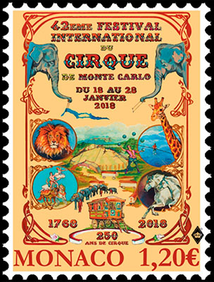 January 3, 2018 the post of Monaco has traditionally released a postage stamp in honor of the International Circus Festival in Monte Carlo.