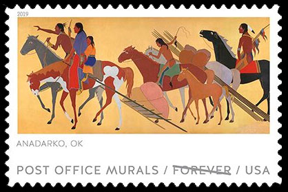 The murals featured on the stamps are Kiowas Moving Camp (1936) from the Anadarko, Okla., post office; Mountains and Yucca (1937), Deming, N.M.; Antelope (1939), Florence, Colo.; Sugarloaf Mountain (1940), Rockville, Md.; and Air Mail (1941), Piggott, Ark. The stamps each include an inscription naming the city and state where the artwork is located.